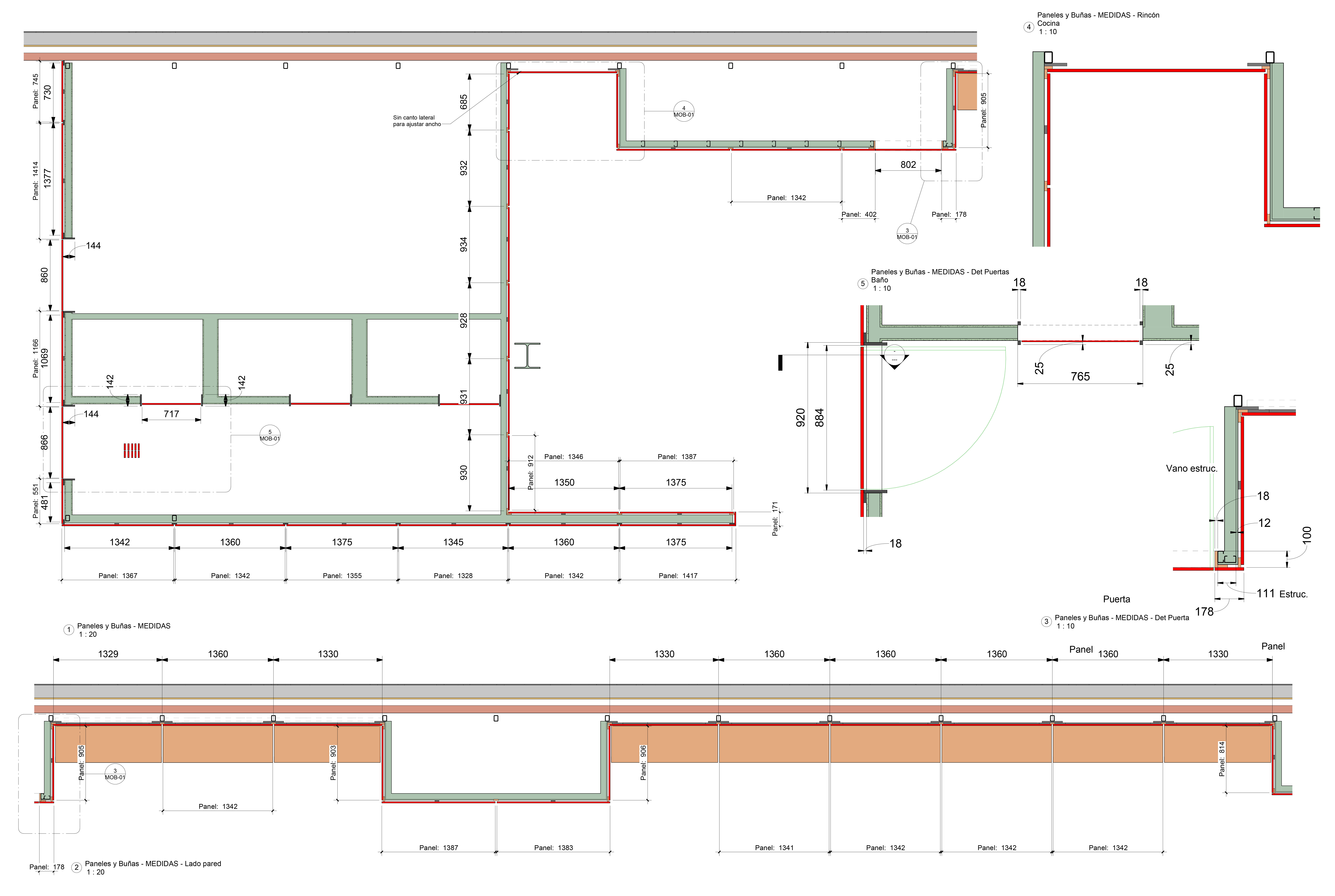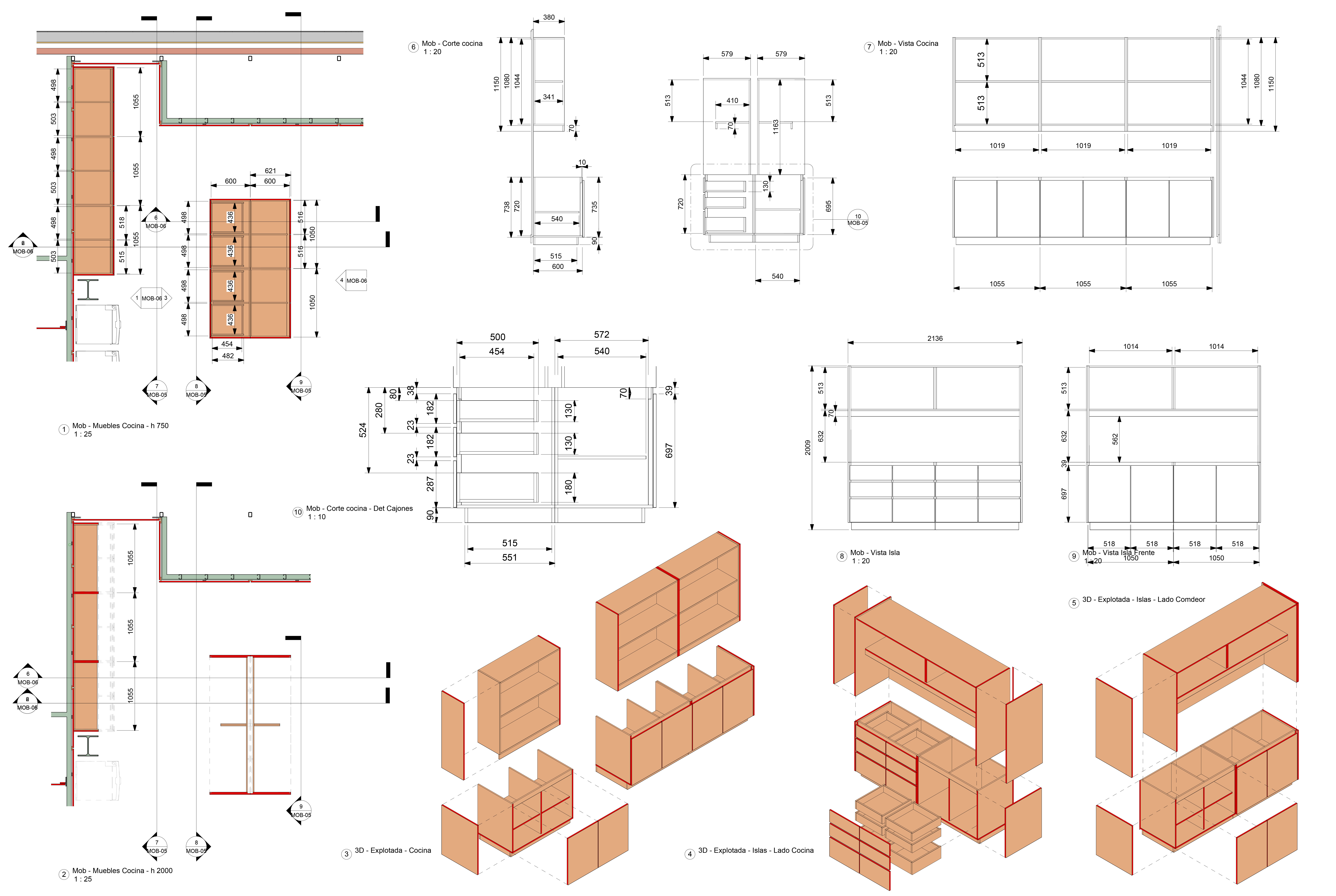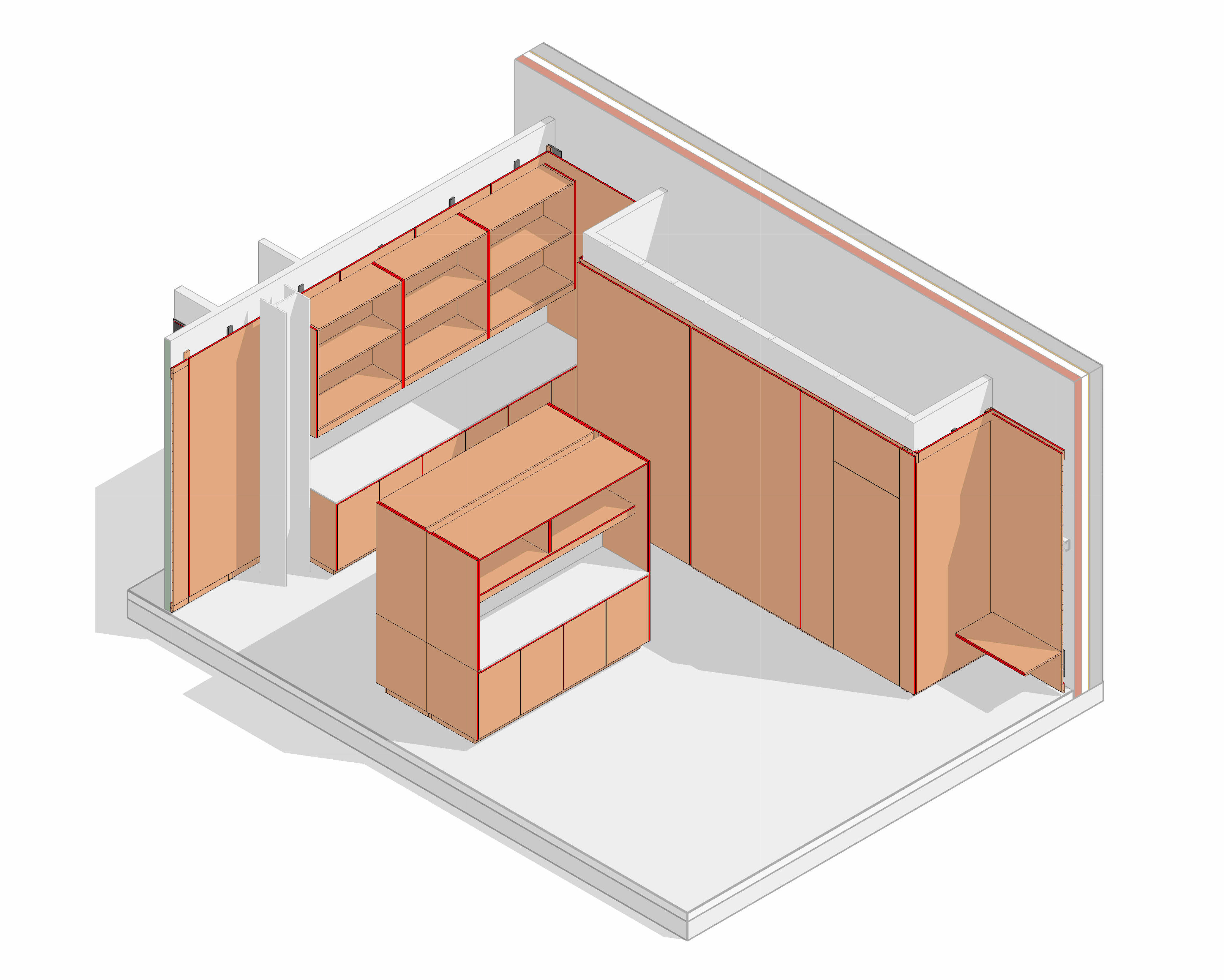 Partimos de información de base provista por el estudio/constructora, generalmente en formatos de imagen, pdf o dwg. A partir de esta información generamos un modelo 3d en Revit del espacio de la obra donde se van a implantar los muebles, y generamos los modelos 3d de cada mueble como familia, de los cuales extraemos directamente listas de corte de las piezas para máquinas CNC de nuestros proveedores.
