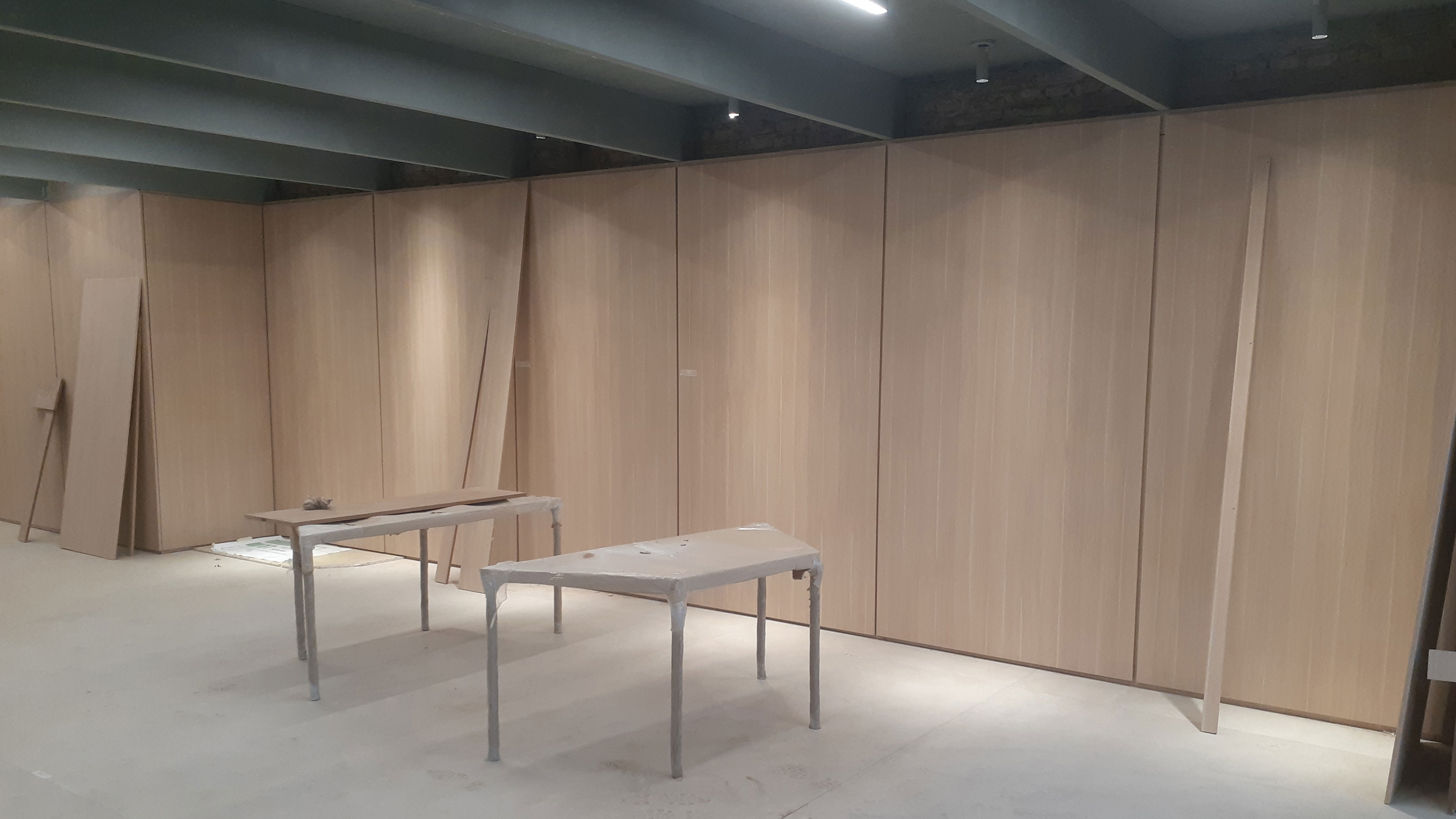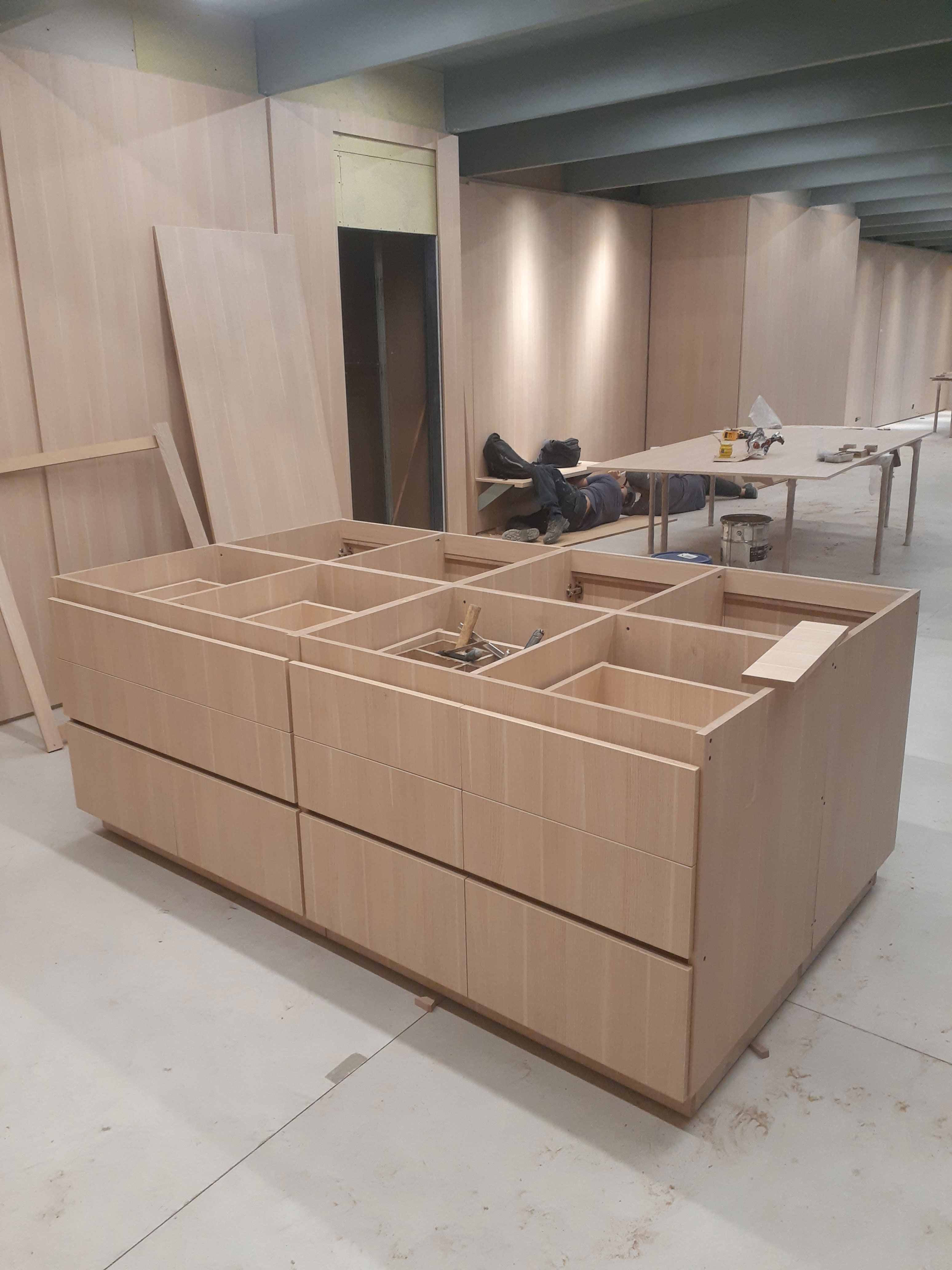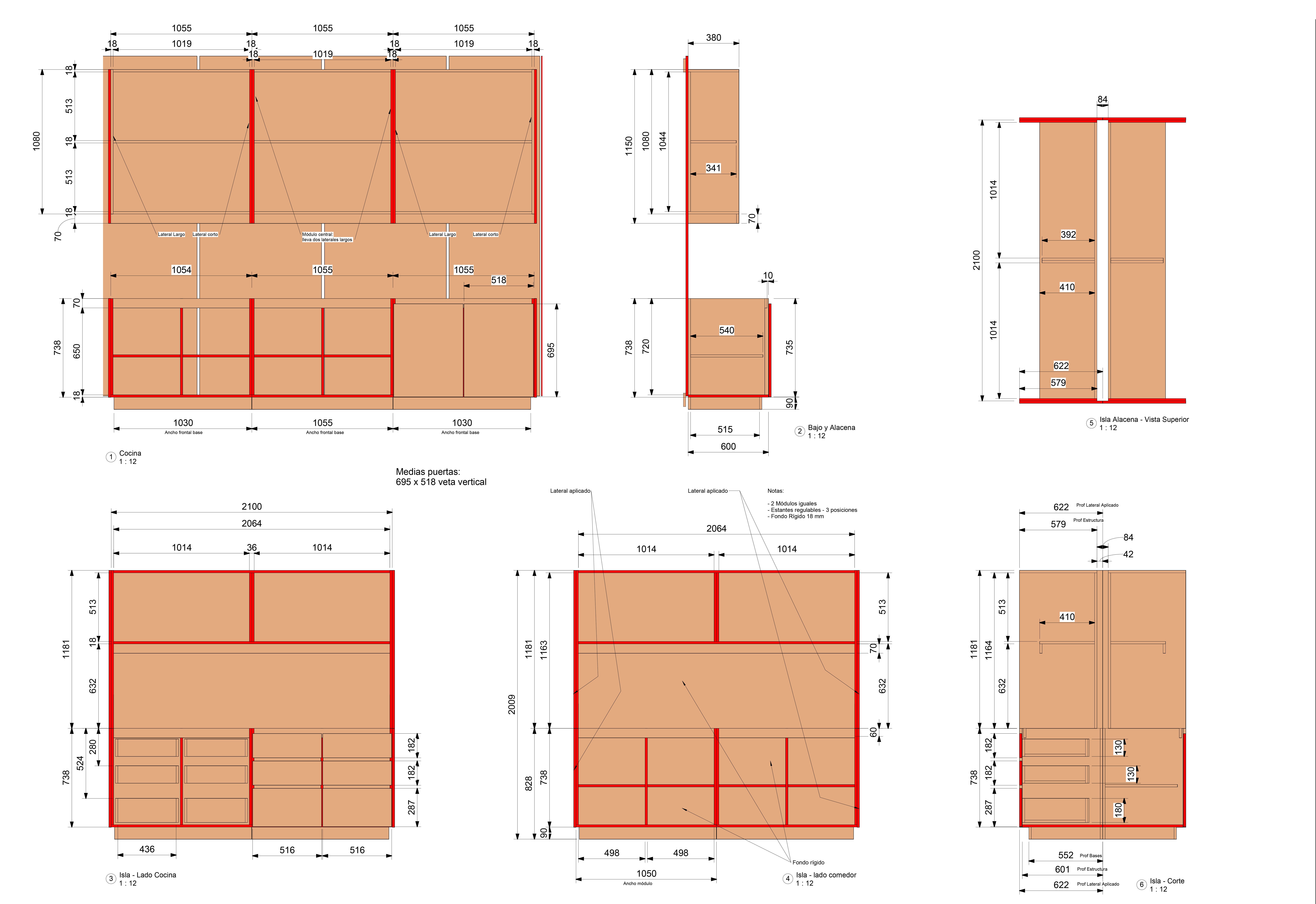 Partimos de información de base provista por el estudio/constructora, generalmente en formatos de imagen, pdf o dwg. A partir de esta información generamos un modelo 3d en Revit del espacio de la obra donde se van a implantar los muebles, y generamos los modelos 3d de cada mueble como familia, de los cuales extraemos directamente listas de corte de las piezas para máquinas CNC de nuestros proveedores.